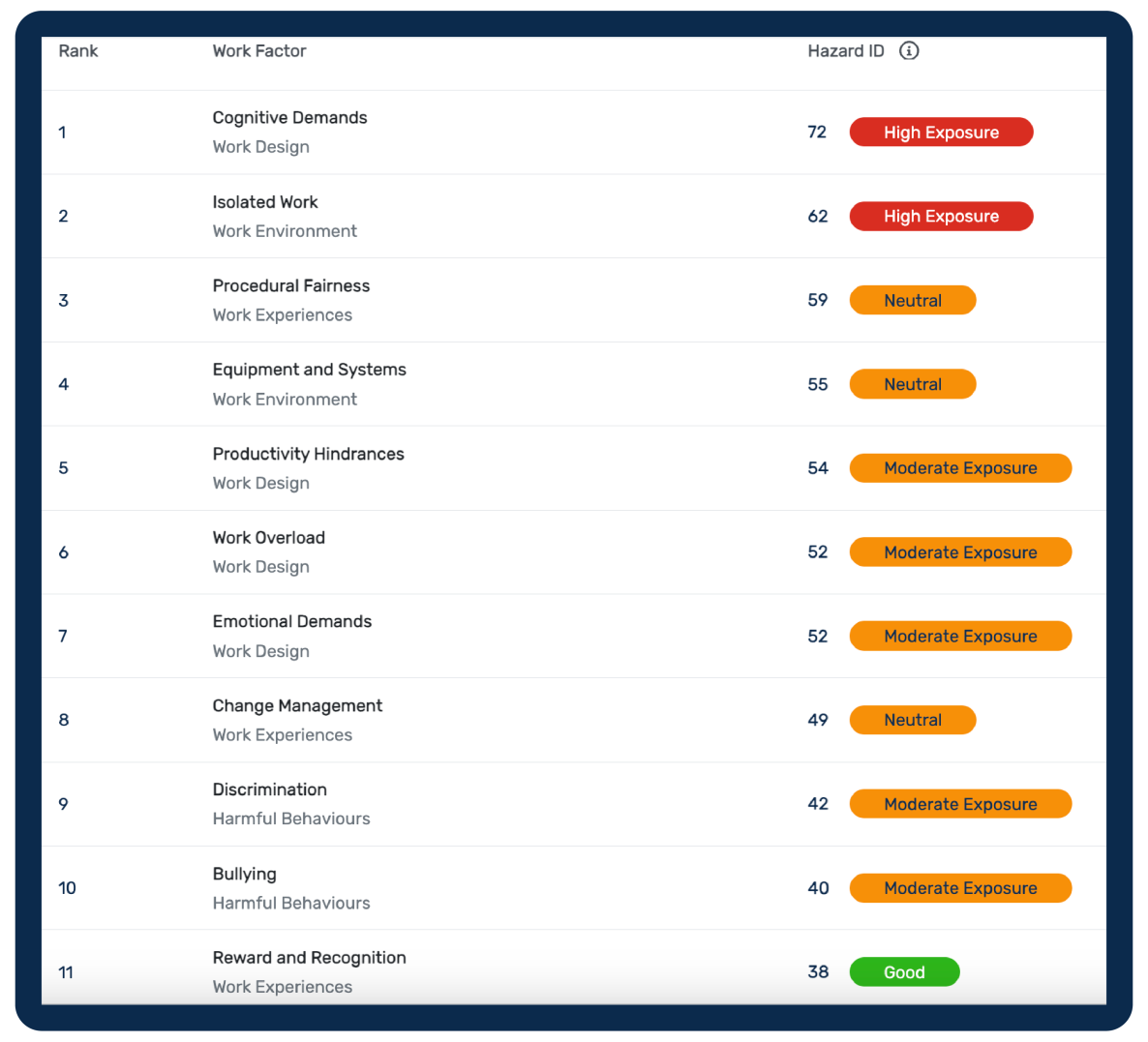 Our survey seamlessly combines rigorous hazard identification and risk assessment within a single validated psychosocial risk assessment process.